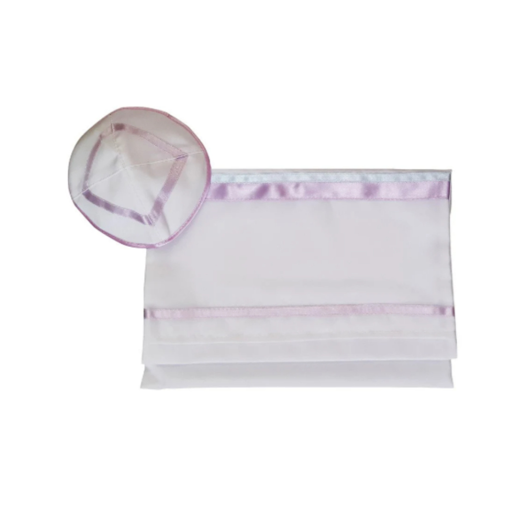 The blessing on the neckband (atarah) is embroidered in Hebrew with matching Lilac on White background.